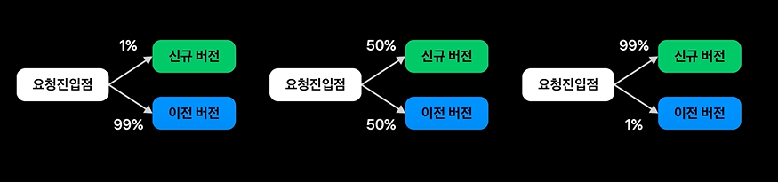 Istio를 이용하면 비율단위의 트래픽 조절이 가능한데요. 왼쪽 케이스와 같이 1% 단위로 신규버전에 적용하는 것을 가능하게하여, 혹여나 Staging 환경에서 발견하지 못한 문제가 Production 환경에서 발생하더라도 빠른 롤백이 가능해 영향범위를 최소화하는것이 가능합니다.