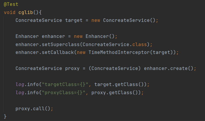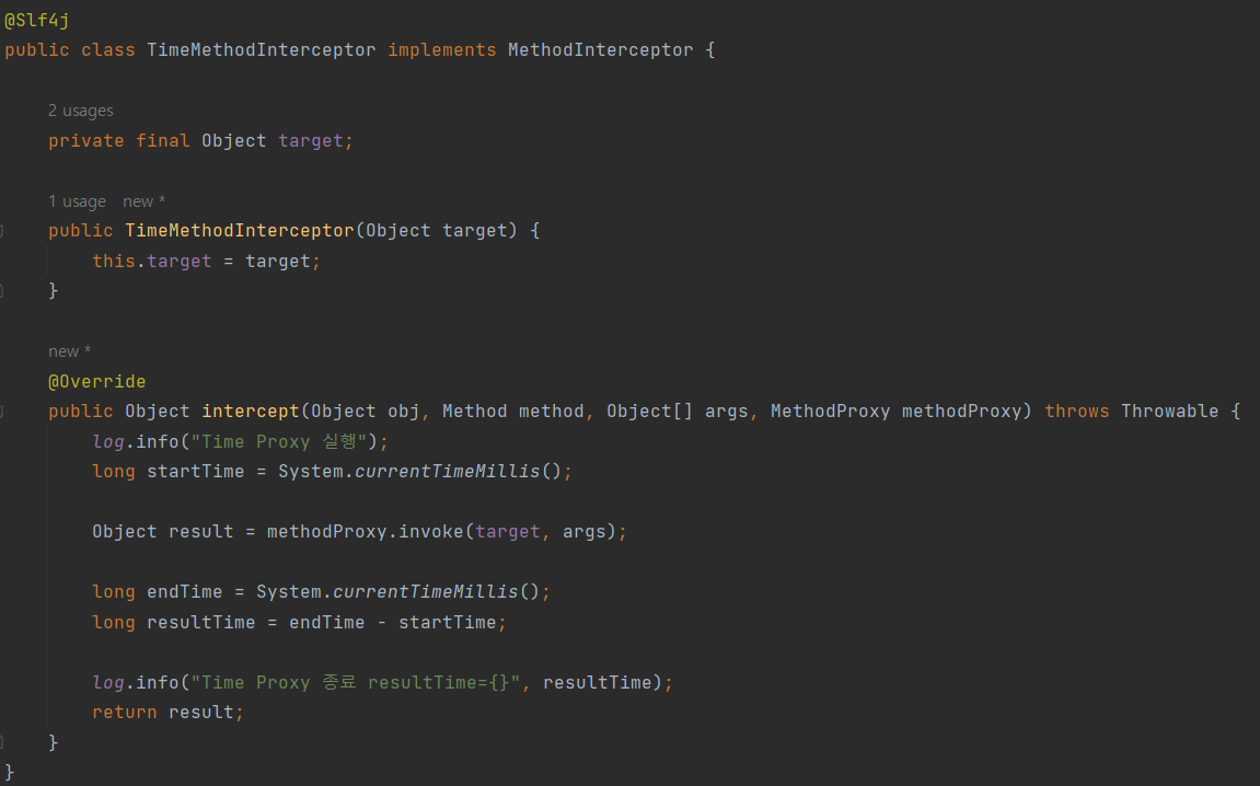 또한 사용은 Enhancer 라는 CGLIB 에서 제공하는 클래스에 방금 전 만들었던 MethodInterceptor를 적용하고, 실제 대상 객체를 적용하여 JDK 동적 프록시와 비슷하게 사용할 수 있습니다.