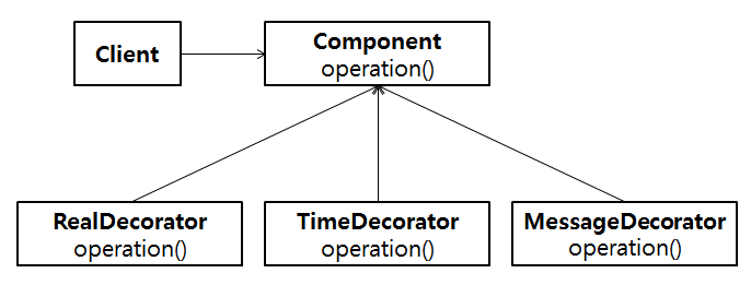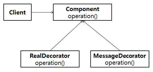 프록시 패턴과 마찬가지로 데코레이터 패턴을 코드로 적용해보면 Component라는 인터페이스를 만들고,