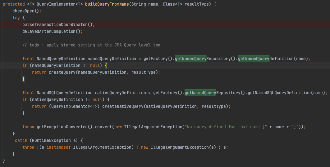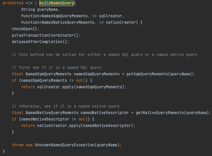 메서드를 분석해본 결과 NamedQuery 가 아니거나 NativeQuery 가 아니면 해당 Exception 을 터뜨려 저희에게 로그를 보여주었던 것입니다.