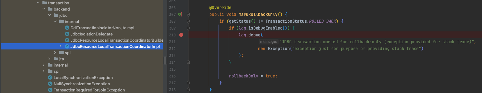 JDBC transaction marked for rollback-only (exception provided for stack trace) 라는 로그가 눈에 띕니다. 검색을 해보니 JdbcResourceLocalTransactionCoordinatorImpl 구현체에 정의가 되어있었습니다.