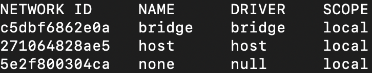 "docker network ls" 명령어를 치게되면 bridge라는 docker network가 있는 것을 볼 수 있다.